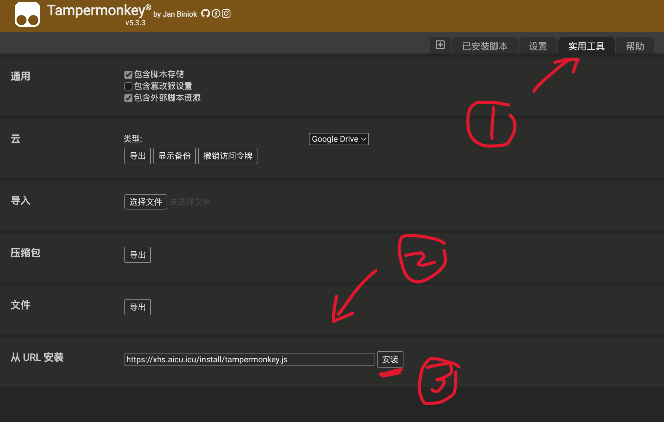篡改猴设置界面,进入实用工具,找到从URL安装输入框 - 复制下方脚本地址到输入框,点击安装,确认。